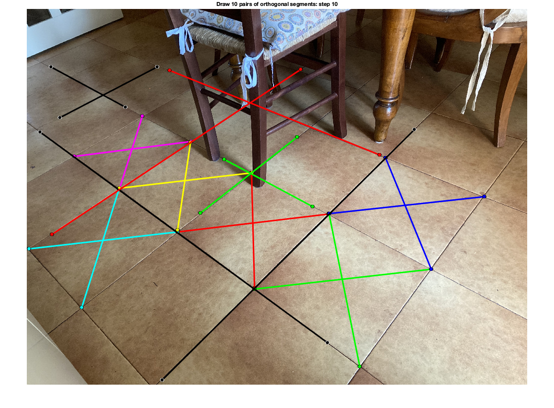 figure; imshow(img); numConstraints = 10; %>=5 hold all; fprintf('Draw 5 pairs of orthogonal segments\n'); count = 1; A = zeros(numConstraints,6); % select pairs of orthogonal segments while (count <=numConstraints) figure(gcf); title(['Draw ', num2str(numConstraints),' pairs of orthogonal segments: step ',num2str(count) ]); col = 'rgbcmykwrgbcmykw'; segment1 = drawline('Color',col(count)); segment2 = drawline('Color',col(count)); l = segToLine(segment1.Position); m = segToLine(segment2.Position); % each pair of orthogonal lines gives rise to a constraint on the image % of the dual conic of principal points imDCCP % [l(1)*m(1),0.5*(l(1)*m(2)+l(2)*m(1)),l(2)*m(2),0.5*(l(1)*m(3)+l(3)*m(1)) % 0.5*(l(2)*m(3)+l(3)*m(2)), l(3)*m(3)]*v = 0 % store the constraints in a matrix A A(count,:) = [l(1)*m(1),0.5*(l(1)*m(2)+l(2)*m(1)),l(2)*m(2),... 0.5*(l(1)*m(3)+l(3)*m(1)), 0.5*(l(2)*m(3)+l(3)*m(2)), l(3)*m(3)]; count = count+1; end