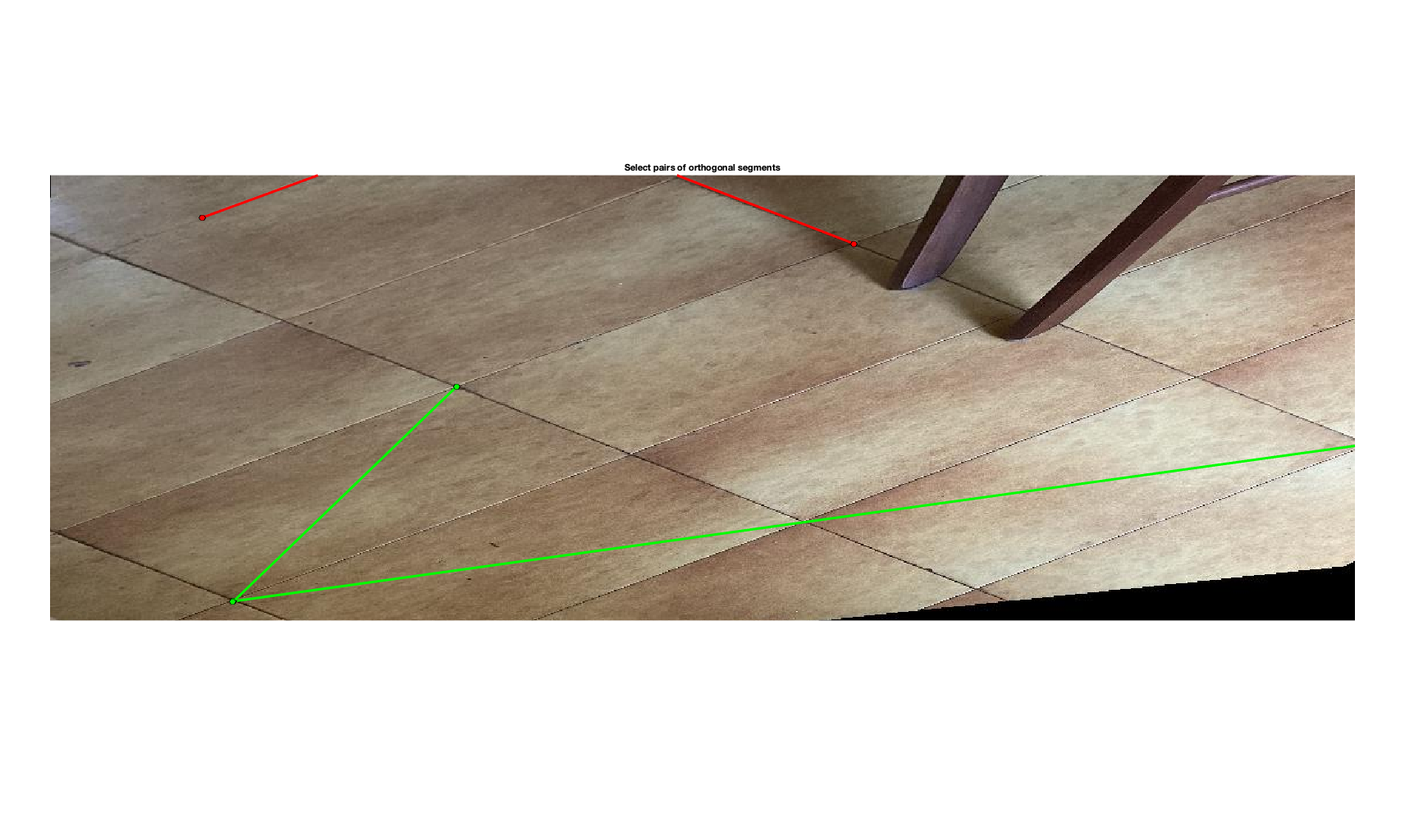 hold all; fprintf('Draw pairs of orthogonal segments\n'); doAgain = 1; count = 1; A = zeros(numConstraints,3); % select pairs of orthogonal segments while (count <=numConstraints) figure(gcf); title('Select pairs of orthogonal segments') col = 'rgbcmykwrgbcmykw'; segment1 = drawline('Color',col(count)); segment2 = drawline('Color',col(count)); l = segToLine(segment1.Position); m = segToLine(segment2.Position); % each pair of orthogonal lines gives rise to a constraint on s % [l(1)*m(1),l(1)*m(2)+l(2)*m(1), l(2)*m(2)]*s = 0 % store the constraints in a matrix A A(count,:) = [l(1)*m(1),l(1)*m(2)+l(2)*m(1), l(2)*m(2)]; count = count+1; end