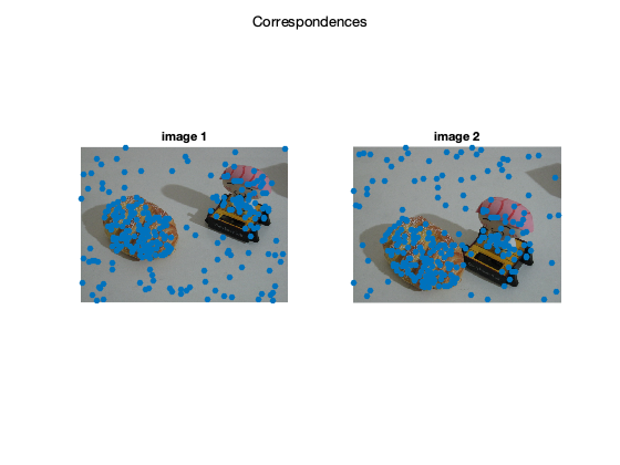 figure; subplot(1,2,1); imshow(img1); hold on; scatter(X(1,:),X(2,:),'filled'); title('image 1') subplot(1,2,2); imshow(img2); hold on; scatter(X(4,:),X(5,:),'filled'); title('image 2'); sgtitle('Correspondences');