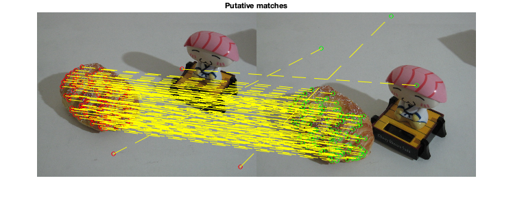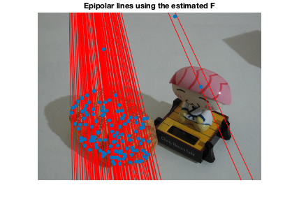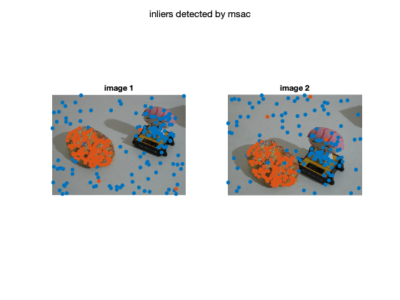figure; subplot(1,2,1); imshow(img1); hold all; scatter(X(1,:),X(2,:),'filled'); scatter(X(1,inliers),X(2,inliers),'filled'); title('image 1') subplot(1,2,2); imshow(img2); hold all; scatter(X(4,:),X(5,:),'filled'); scatter(X(4,inliers),X(5,inliers),'filled'); title('image 2'); sgtitle('inliers detected by msac'); % display matched inliers figure; showMatchedFeatures(img1,img2,X(1:2,inliers)',X(4:5,inliers)','montage','PlotOptions',{'ro','go','y--'}); title('Putative matches'); % display the epipolar lines in the second image % inlers should be close to their corresponding epipolar line epiLines = epipolarLine(F,X(1:2,inliers)'); points = lineToBorderPoints(epiLines,size(img2)); figure; imshow(img2); hold all; line(points(:,[1,3])',points(:,[2,4])','Color','red'); scatter(X(4,inliers),X(5,inliers),'filled'); title('Epipolar lines using the estimated F');