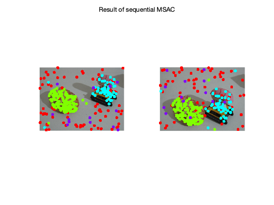 figure; subplot(1,2,1); imshow(img1); hold on; gscatter(X(1,:),X(2,:),C); legend off; subplot(1,2,2); imshow(img2); hold all; gscatter(X(4,:),X(5,:),C); legend off; sgtitle('Result of sequential MSAC')